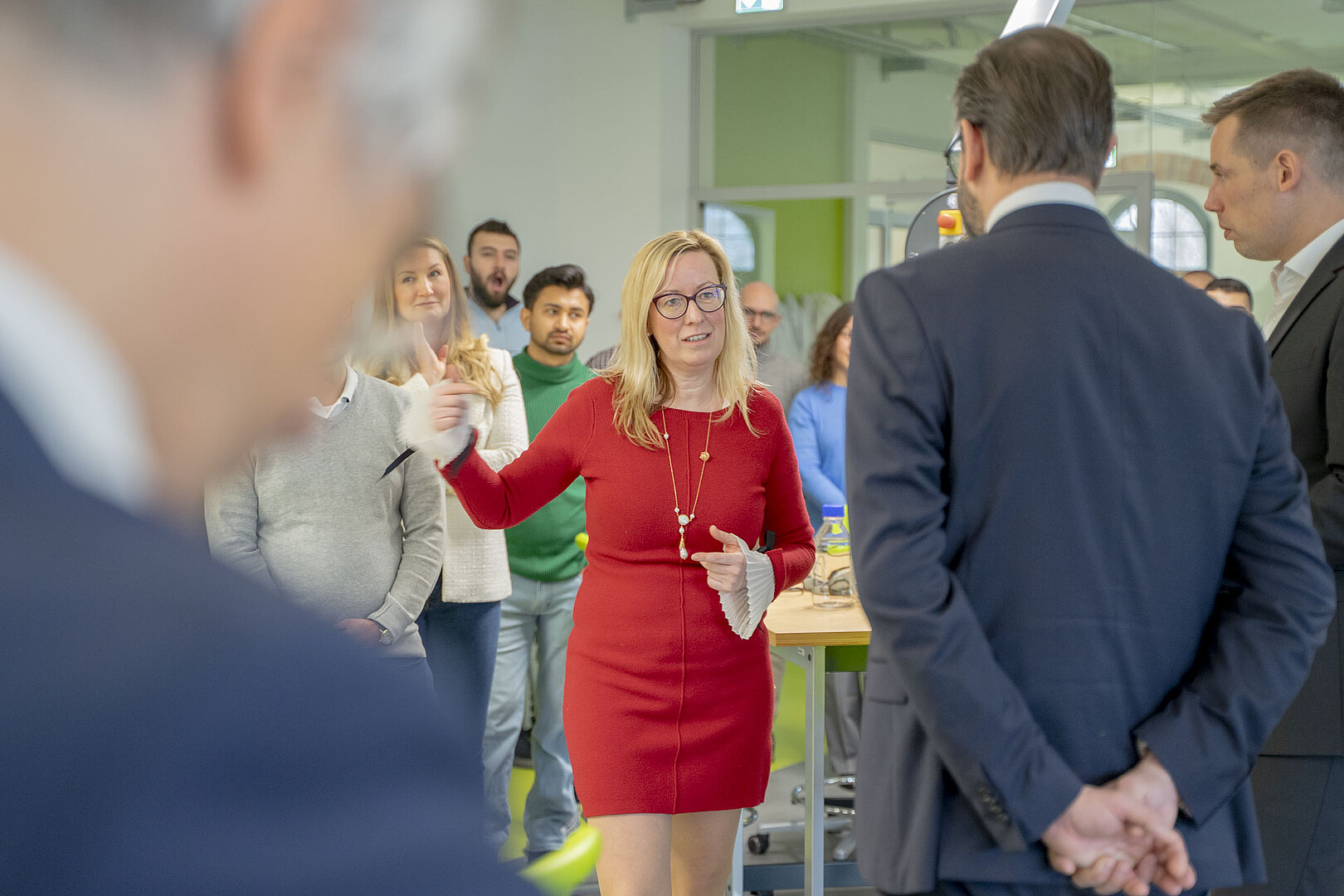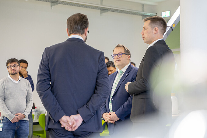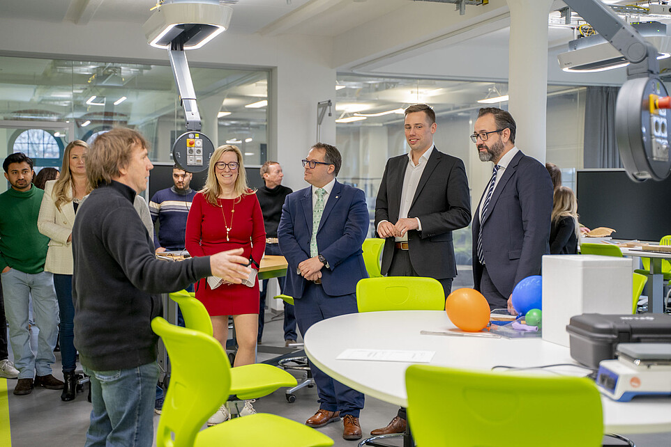 Zum Abschluss des Besuches des Sächsischen Staatsministers für Wissenschaft, Sebastian Gemkow, und des Bundestagsabgeordneten Florian Oest standen ein Besuch des DLR_School_Labs, des Schullabors der HSZG, und des ZukLOS (Zukunftslernort Oberlausitz) der HSZG. Hier stellte das Team um Dr. Thomas Fester Aufgaben und Ziele des Schullabors vor. Es soll Forschung für Schülerinnen und Schüler erlebbar machen und Begeisterung für Naturwissenschaften und Technik wecken, auch mit einer regionalen, nationalen und internationalen Ausrichtung. „Bei uns im ZukLOS arbeiten auch viele Menschen mit einem internationalen Hintergrund. Für uns an der HSZG ist es sehr wichtig, dass wir auf diese Weise unseren Besucherinnen und Besuchern neben den naturwissenschaftlichen Inhalten auch eine internationale Perspektive vermitteln können“, sagt Dr. Thomas Fester, Leiter des DLR_School_Lab der Hochschule Zittau/Görlitz.