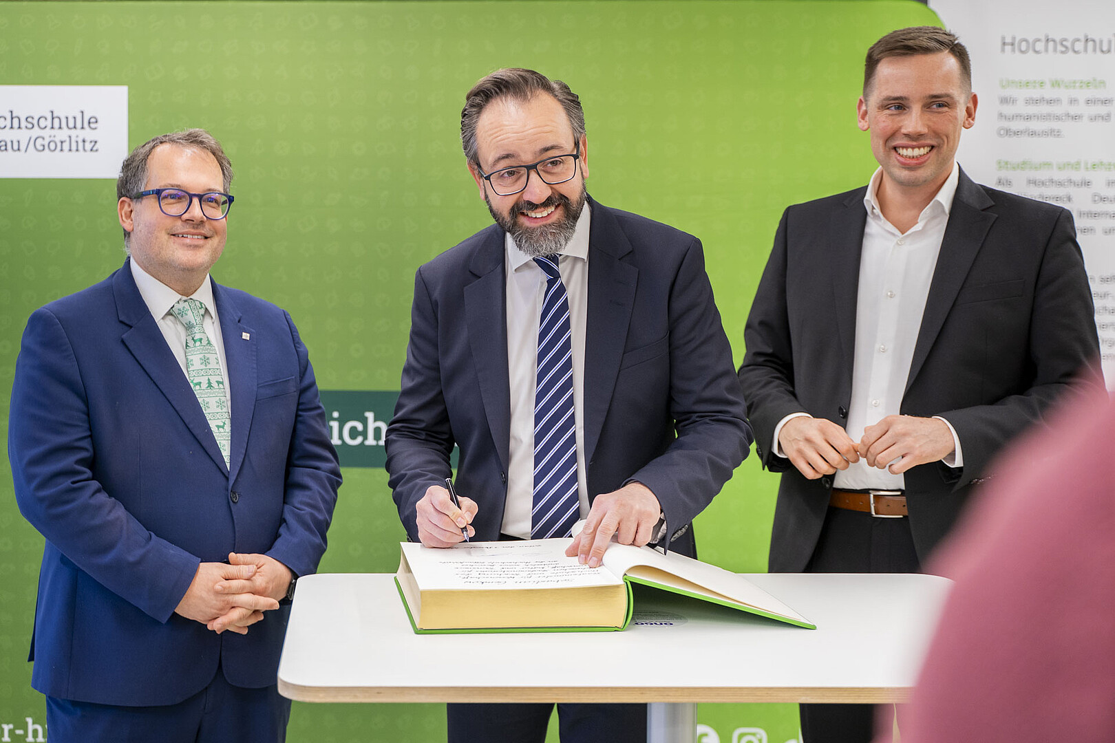 Für mich ist dieser Besuch weit mehr als ein offizieller Termin – er zeigt, was unsere Hochschule im Kern ausmacht: ein Ort, an dem Herz, wissenschaftliche Neugier und gemeinschaftliches Engagement täglich zusammenfinden. Die HSZG ist für mich tatsächlich das „beste Plätzchen“, weil hier Menschen mit Leidenschaft an einer guten Zukunft für unsere Region arbeiten. Besonders dankbar bin ich für den engen, vertrauensvollen Austausch mit Vertreter*innen des Freistaates Sachsen und der Bundesrepublik. Dass Wissenschaftsminister Sebastian Gemkow und Bundestagsabgeordneter Florian Oest bei uns waren, bedeutet mir persönlich sehr viel – es zeigt, dass unsere Anliegen gesehen werden und dass wir gemeinsam daran arbeiten, die Hochschullandschaft in dieser besonderen Dreiländerregion weiter zu stärken.