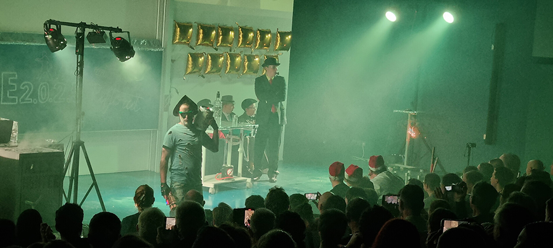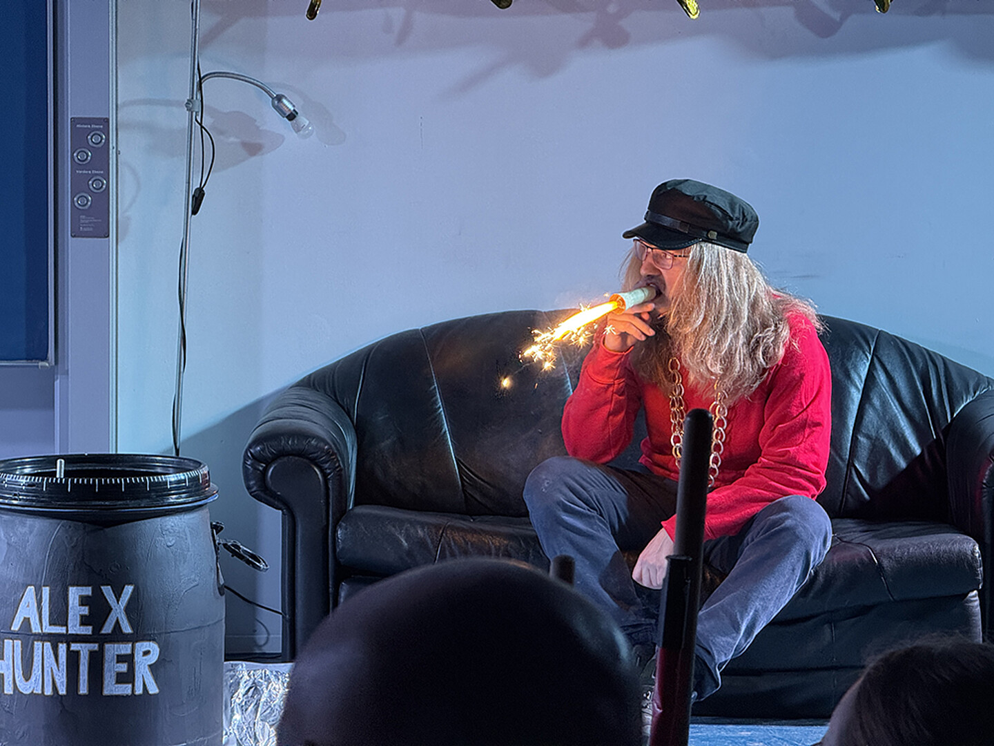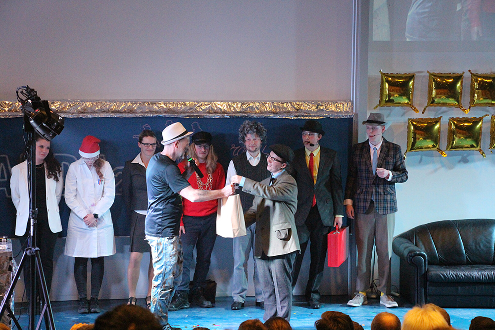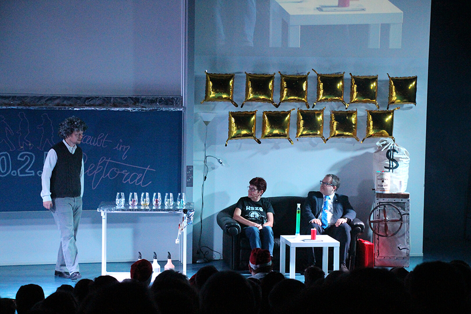 Zwischen den Experimenten spielte das Team humorvolle Szenen rund um die Frage, wie das Rektorat mit der plötzlichen Rückkehr des „berüchtigt-unberechenbaren“ Egon umgeht – inklusive einiger selbstironischer Seitenblicke auf den Hochschulalltag. Knicklichter, Eis, Bier und Menschellimo sorgten für das passende Ambiente. So wurde aus der größten Hochschulbrauerei Zittaus „Ein edles Kratzsch“ serviert. Das von Karin Hollstein und Alexander Kratzsch signierte Fass wurde am Ende der Veranstaltung nach zwei Geboten für 25 Euro versteigert.