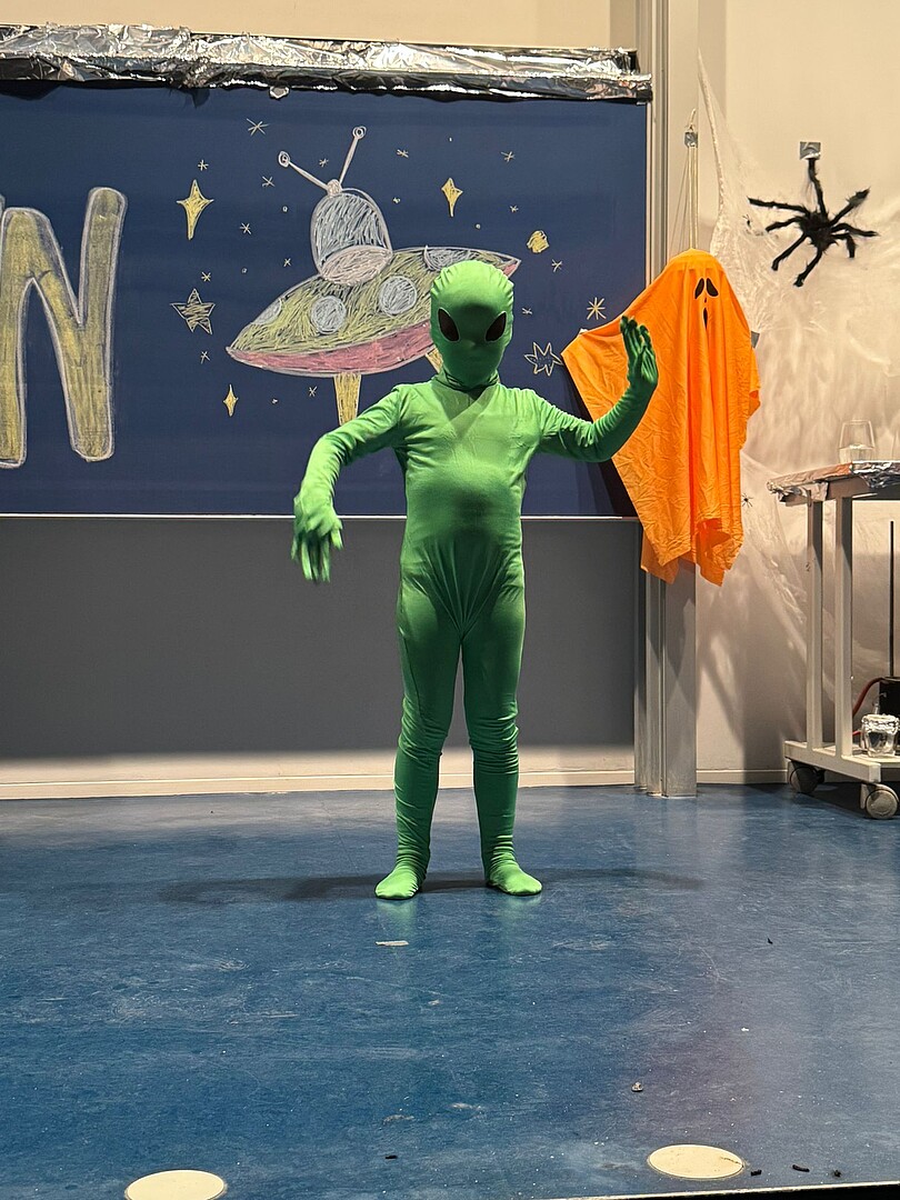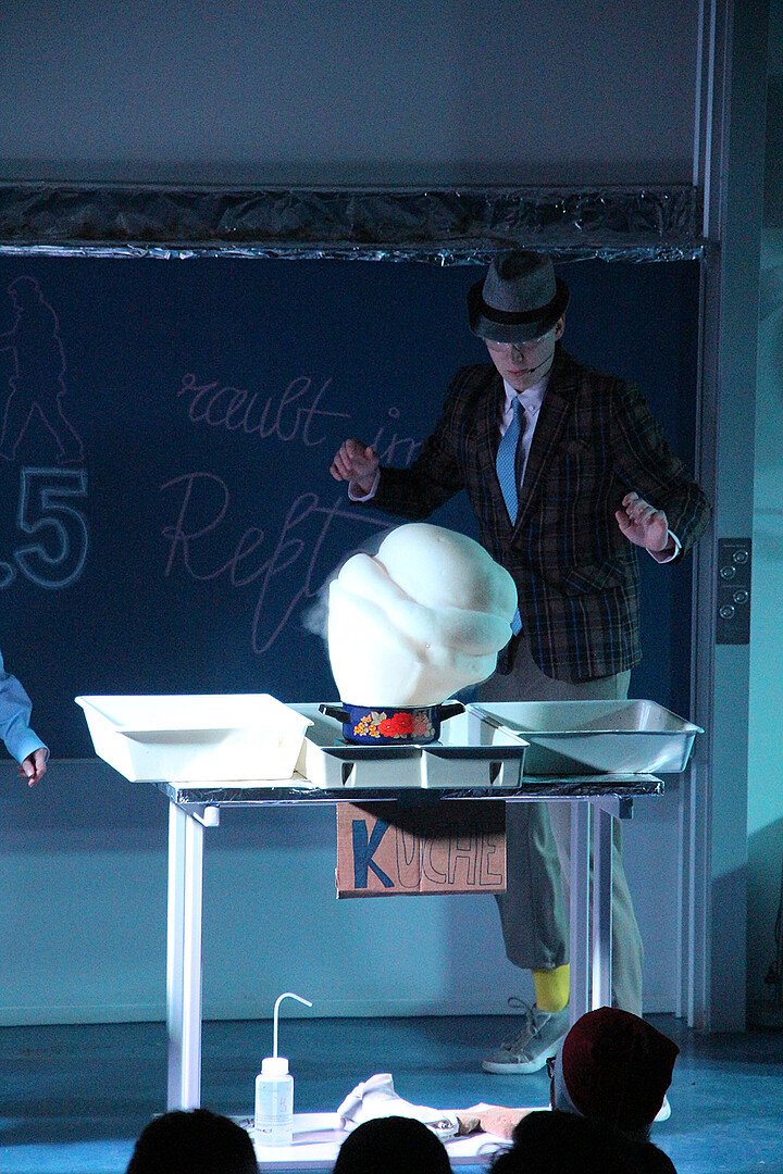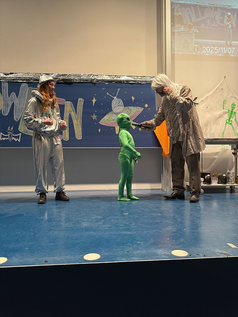 Mit seinem Geisteraktivitätszähler ging ein Geisterjäger auf Spuk-Spurensuche und löschte alle fragwürdigen, extraterrestrischen Aktivitäten aus, die der Außerirdische Nano vom Planeten X bei seinem Besuch hinterlassen hatte. Geisterhände lösten sich auf magische Weise auf und ein neonfarbiges Lichtspektakel sorgte für staunende Kindergesichter. Mit 150 Kindern war die Kinder-Chemieschauvorlesung so gut besucht wie noch nie.