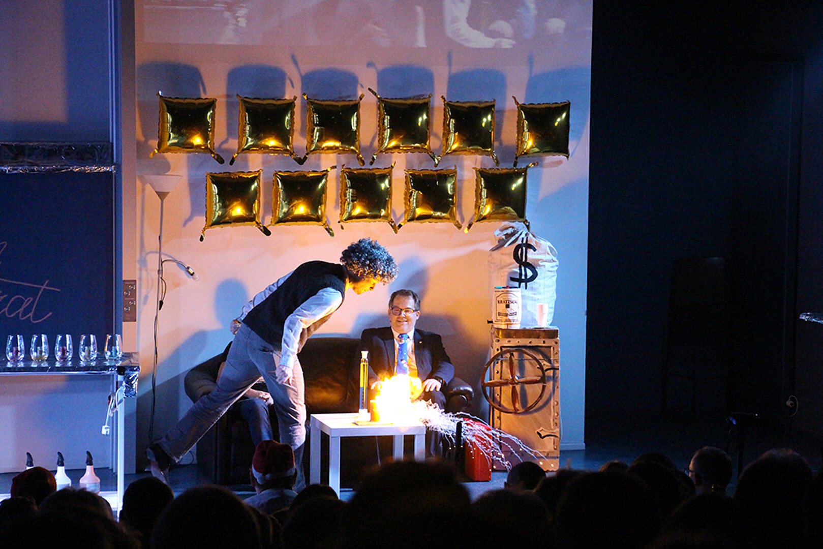 Die Antwort lieferten die Studierenden und Lehrenden der Fakultät Natur- und Umweltwissenschaften in einem fulminanten Bühnenprogramm, das klassische Elemente der beliebten Schauvorlesungen aufgriff und neu inszenierte. Dazu gehörten: