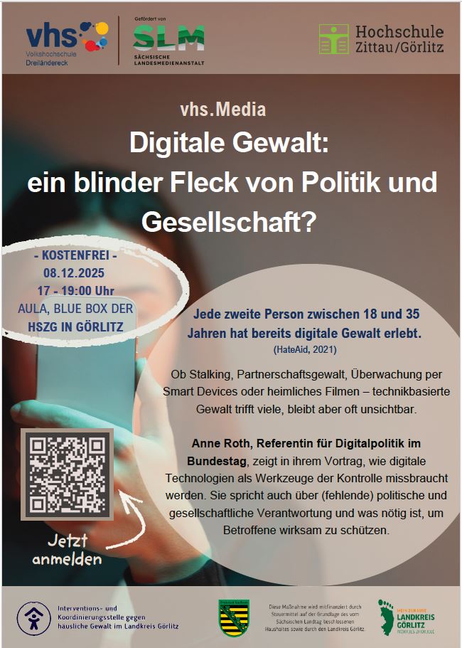 Die Veranstaltung wird organisiert von der VHS-Dreiländereck im Rahmen des Projekts vhs.Media und findet in Kooperation mit der Interventions- und Koordinierungsstelle für häusliche Gewalt LK Görlitz (IKS) sowie der Hochschule Zittau/Görlitz statt.