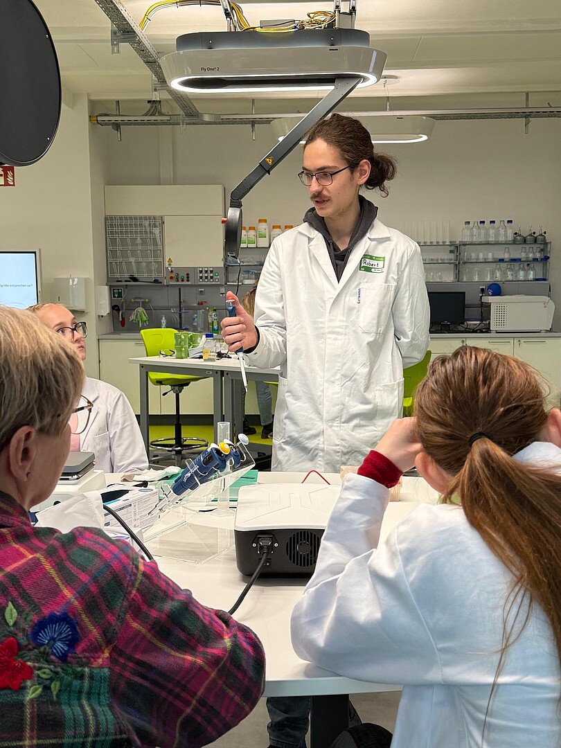 Zwei Bufdis stehen im weißen Laborkittel im School Lab.